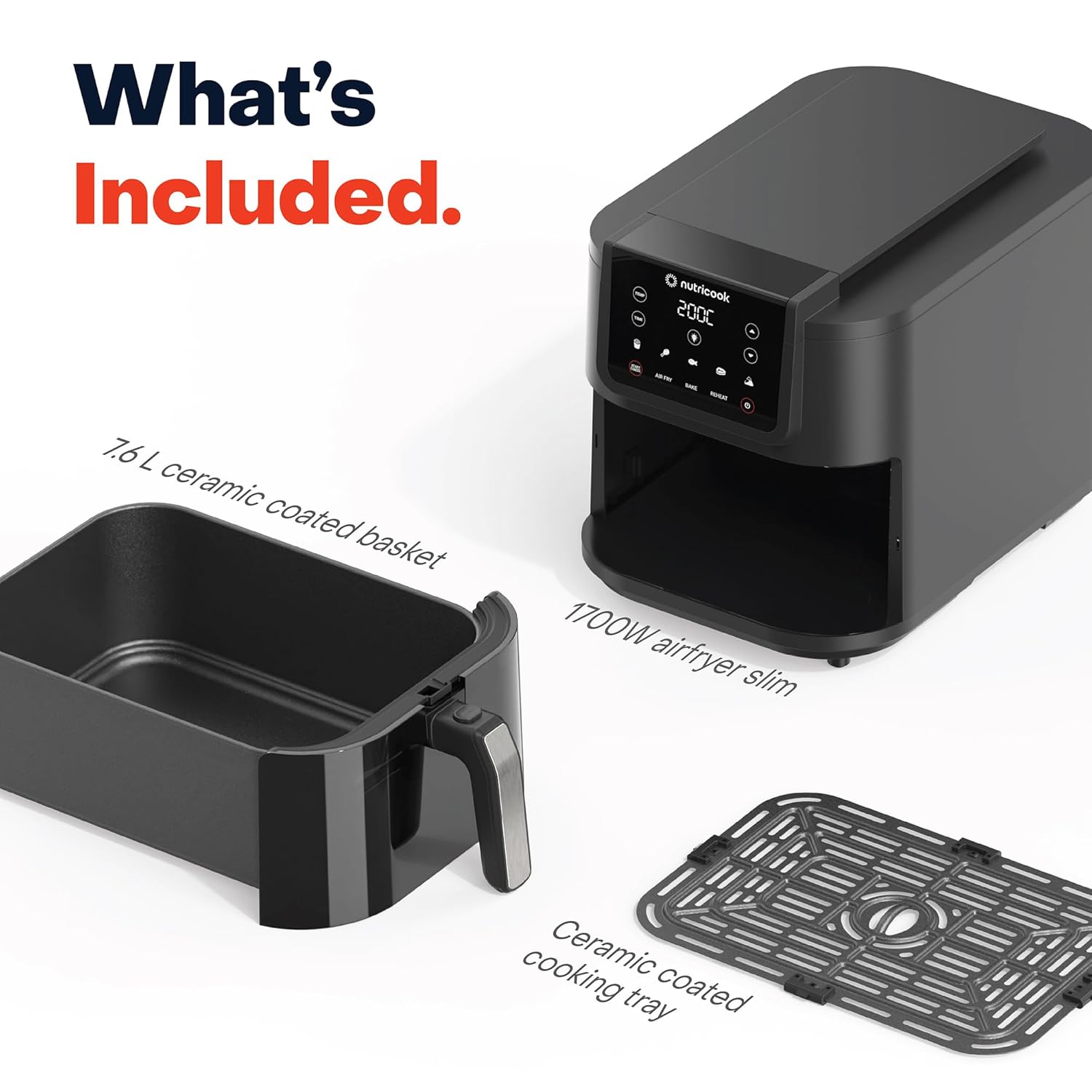 Nutricook 7.6 Litre Air Fryer Slim XL, 2025 New Launch, Clear Window & Interior Light, Extra Large Basket, Space-Saving Slim Design, Air Fry, Bake, Reheat, with 5 Preset, 1700W, 2 Year Warranty